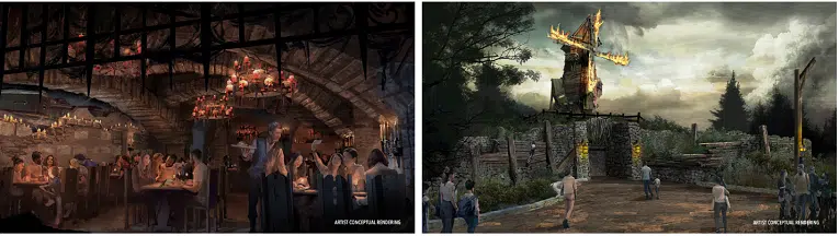 - The Burning Blade Tavern – Despite the blades of the windmill still smoldering and flaming periodically, Darkmoor’s monster hunters have transformed this old fiery mill into their favorite hangout. While enjoying a menu of burgers, wings, bratwurst, pretzels and specialty beverages, guests will hear stories of the infamous “Hounds” – boastful hunters from beyond Darkmoor – all while surrounded by an impressive display of the monster heads they consider their “trophies.”